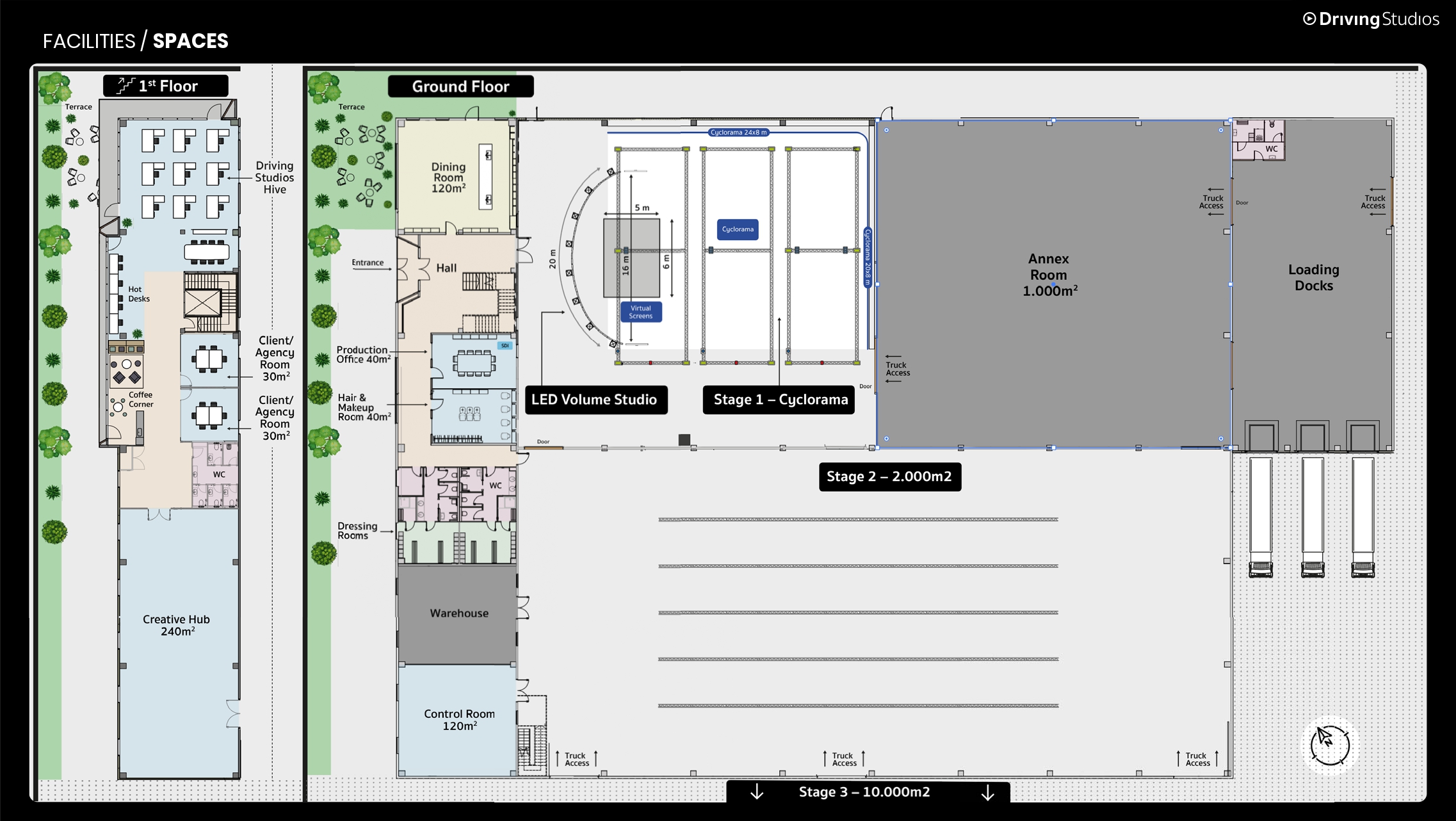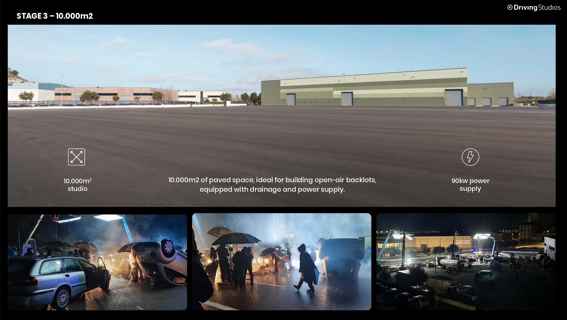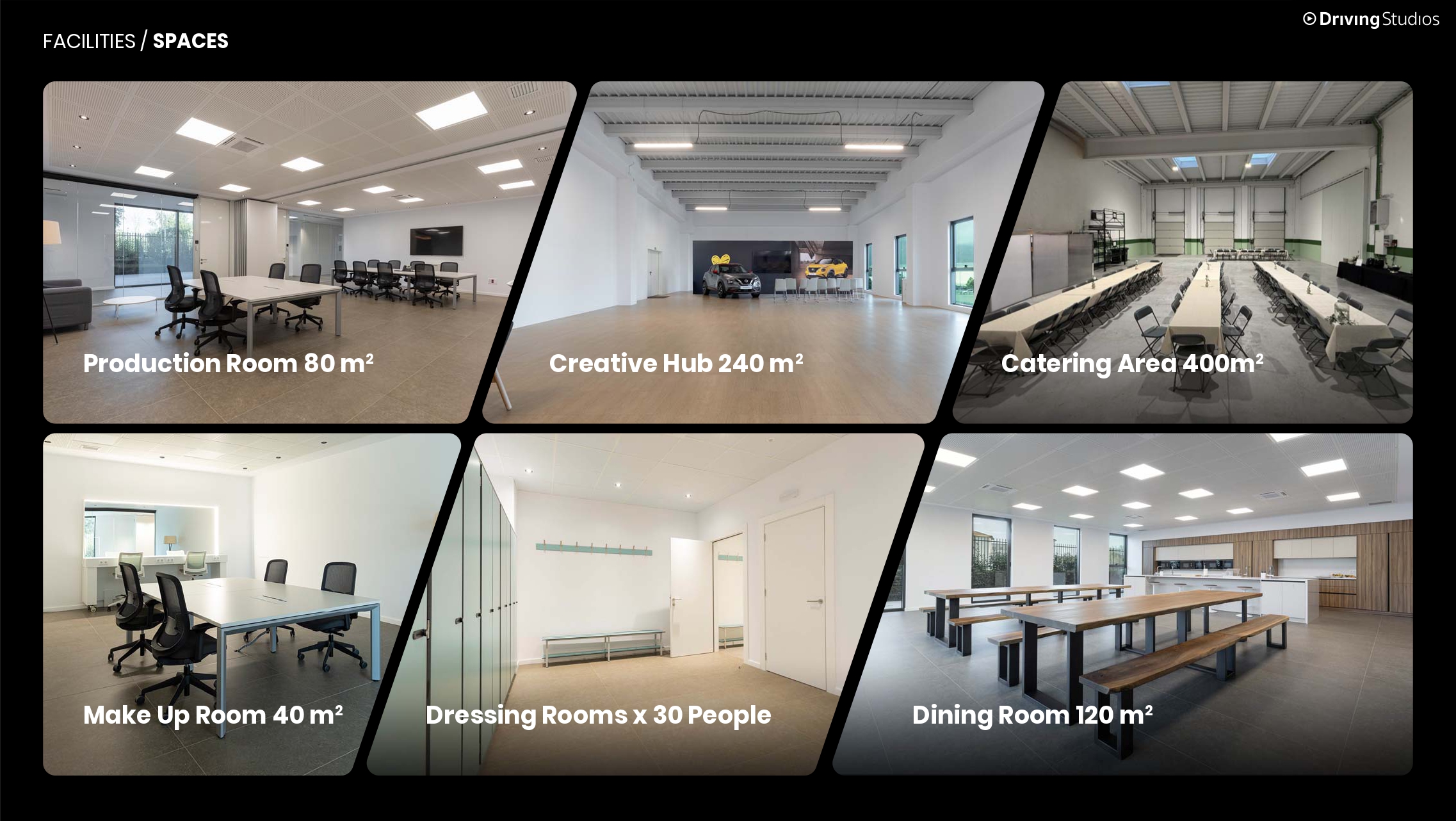 Áreas disponibles: Sala de producción, sala de maquillage&peluqueria, 2 vestidores para 30 personas, zona de cátering de 400m2, cocina-comedor, 2 salas de reuniones, 1 sala polivalente de 240m2, campa exterior de 10.000m2, acceso para vehiculos, certificación TISAX.