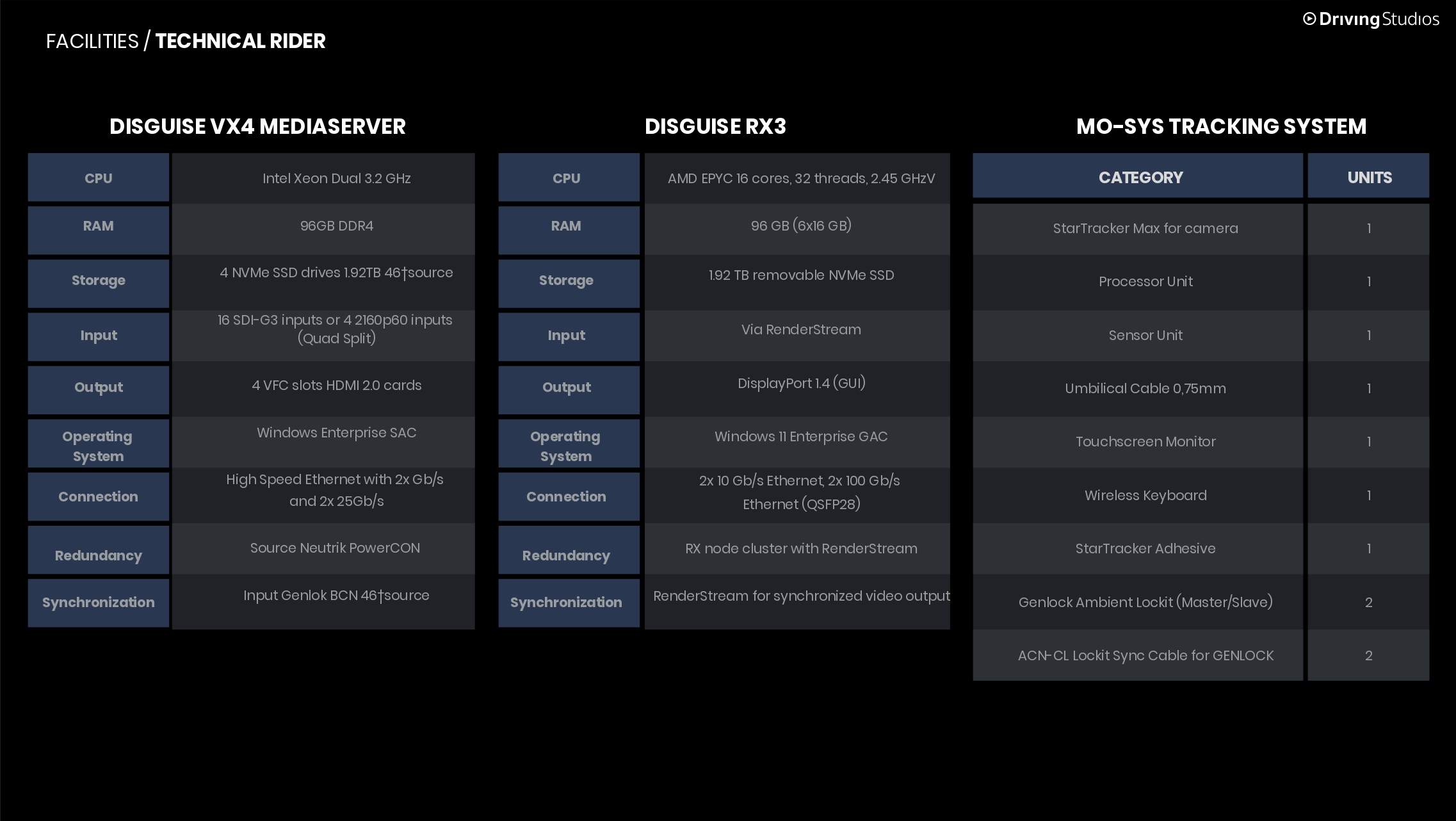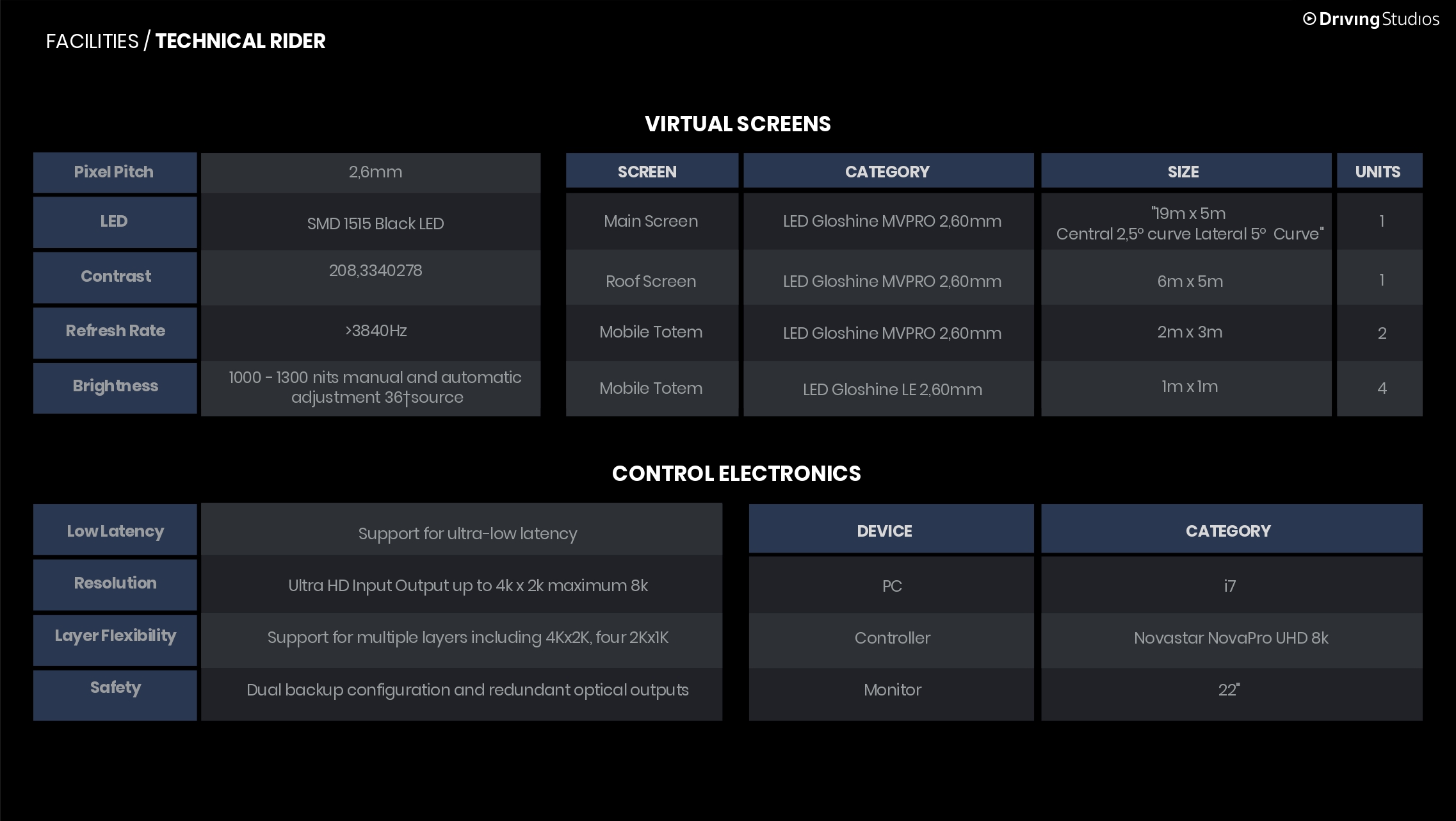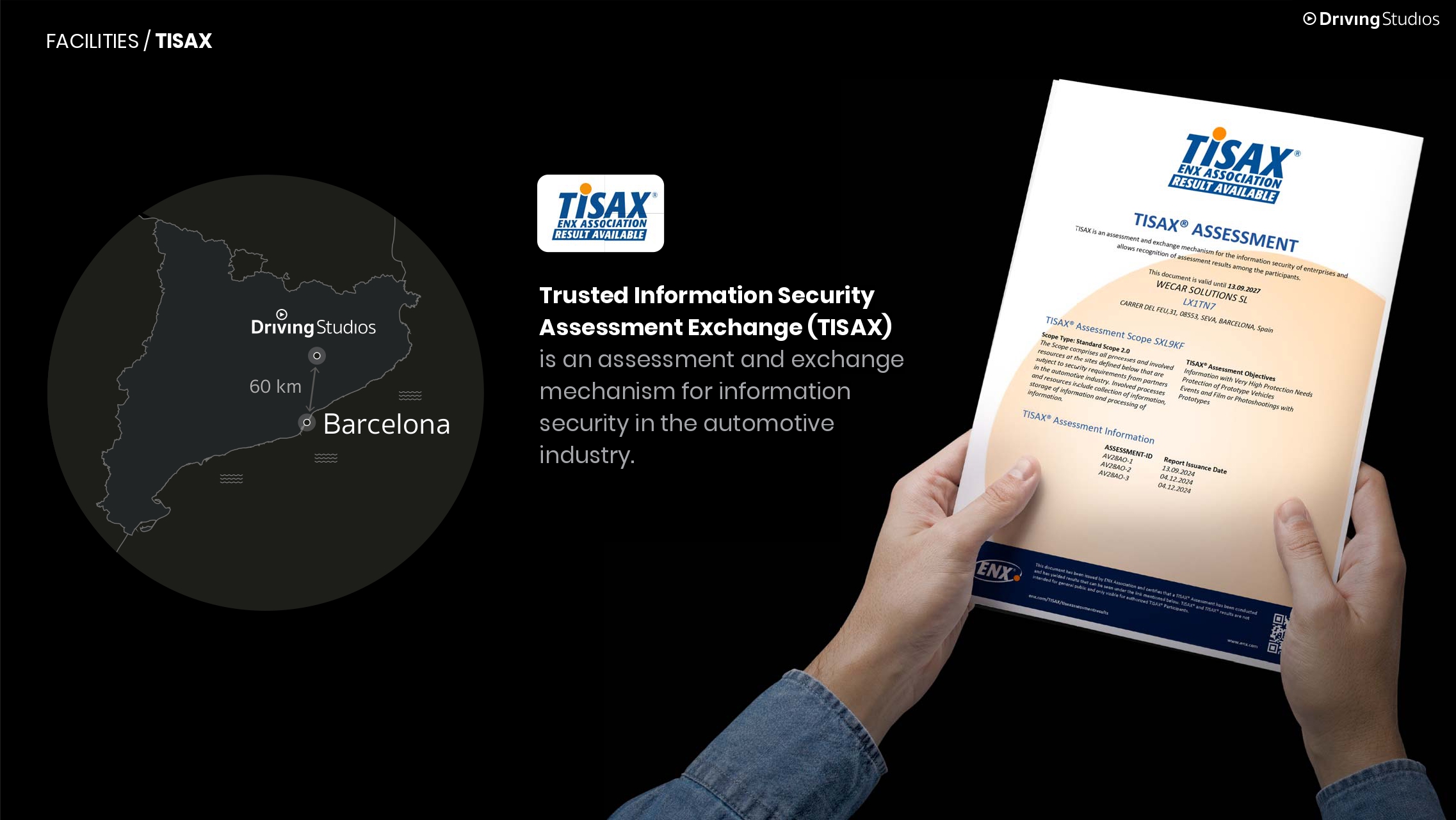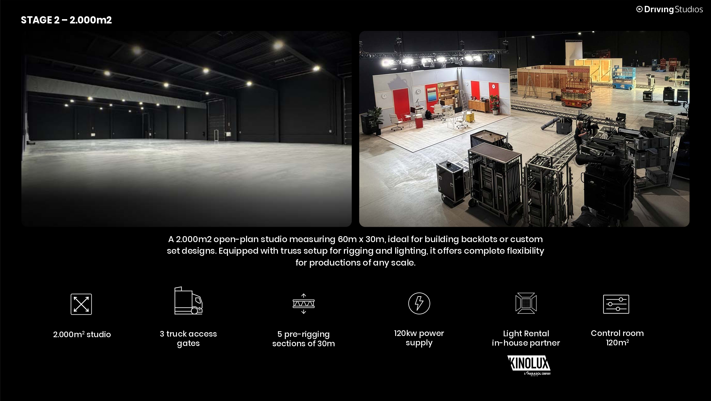 Áreas disponibles: Sala de producción, sala de maquillage&peluqueria, 2 vestidores para 30 personas, zona de cátering de 400m2, cocina-comedor, 2 salas de reuniones, 1 sala polivalente de 240m2, campa exterior de 10.000m2, acceso para vehiculos, certificación TISAX.